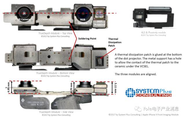 Yole和System Plus咨询公司的拆解分析在苹果的光纤集线器中发现了一个“五个子模块的复杂组合”。它们分别是:近红外摄像机、飞时测距探测器+红外泛光照明器、RGB摄像机、点状图案照明器和彩色/环境光传感器。