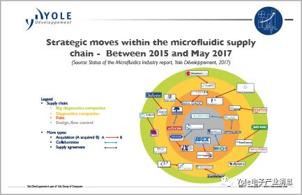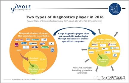 大型诊断公司正在竞相收购最有前途的微流体公司。他们通常在他们庞大的产品组合中提出一些成功的微流体解决方案:包括雅培Abbott、艾利尔Alere、生物梅里埃bioMérieux和罗氏Roche 在微流体解决方案的驱动下至少在其中一个细分市场区隔上见证了增长。这些成功案例来自过去几年稳固的产业结构:在众多开发微流体产品的公司中,最有前途的产品往往会被大型诊断公司收购。一些分子诊断学最具创新性的参与者就是这种情况:IQuum和BioFire,以及最近的Cepheid和Nanosphere,这些公司都被更大的企业收购。同时,GenePOC收到了来自Debiopharm的大量投资(更多信息请访问i-micronews.com)。