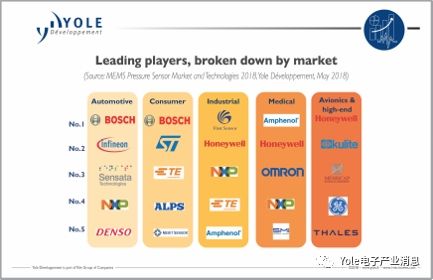 Yole传感与显示技术与市场分析师Yann de Charentenay表示:“竞争格局随市场类型而有很大差异。他详细说明指出:“在高产量的汽车和消费市场,罗伯特博世显然是占主导地位的领导者。这是一个独特的位置。罗伯特博世已成功利用其汽车产品领先地位成为新兴消费市场的领导者。“