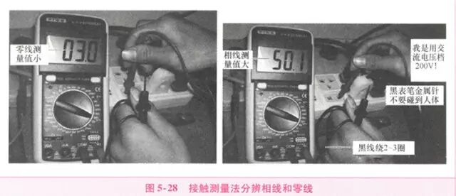 将数字万用表拨至交流20V挡(或交流2V挡),取下黑表笔,将黑表笔插入V/Ω插孔,一手握住红表笔的绝缘杆,用表笔尖依次碰触两个插孔,显示值较大的为火线,如图5-28所示。
