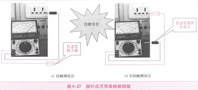 将万用表转换开关置于交流250V或500V挡,第一支表笔接电源的一端,第二支表笔接大地(比如水管、暖气片等上面或潮湿的地面)。如果接地良好,当万用表读数为220V左右时,第一支表笔接的是电源的火线,如图5-27(a)所示。如果指针不动,说明第一支表笔接的是电源的零线。即使第二支表笔接地电阻大,当第一表笔接火线时,指针也会有明显的偏转。