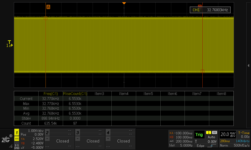 在参数测量的统计参数中,有“上升沿计数”的方法,其原理是测量上升沿的个数。在测试中,可以将测量范围选择光标区域,而光标范围设为200ms,这样测得的上升沿乘以5,即为信号频率。