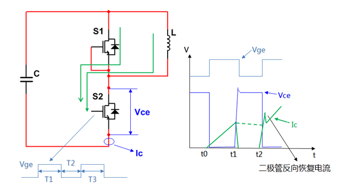 如图3所示,t1到t2之间,IGBT关断,此时电流流向如原理图绿线所示,负载的电流L的电流由上管二极管续流,该电流缓慢衰减,如图3波形图虚线所示。
