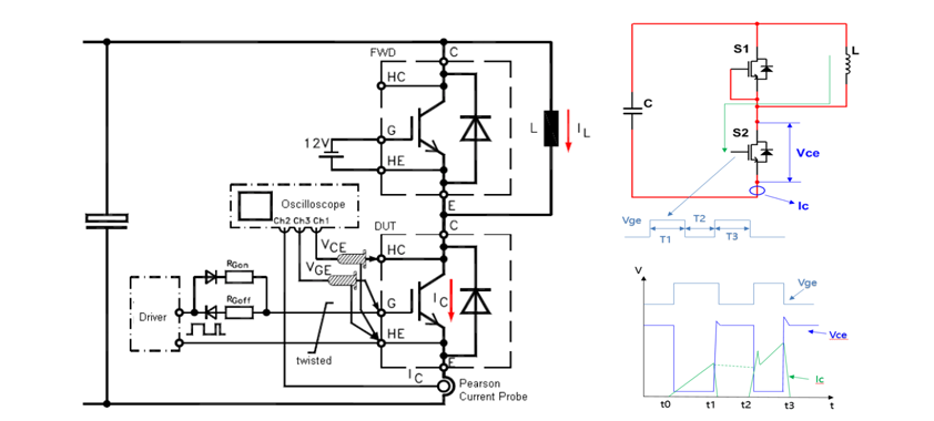 用高压隔离探头测量Vce及Vge的电压大小,用罗氏线圈测量电流Ic的大小,测试结果通过示波器进行监控;上管IGBT的Vge加负压或直接短路,因此它是关断的,只有其并联的二极管起续流作用,在实际测试过程中可以用二极管替代。具体测试原理如下: