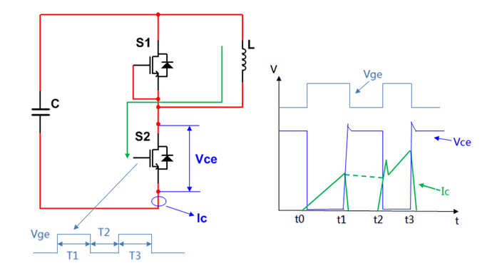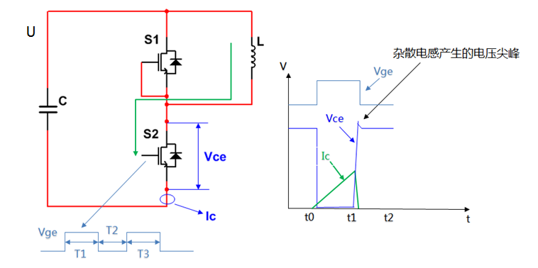 t1时刻,IGBT关断,因为母线杂散电感Ls的存在,会产生一定的电压尖峰,该尖峰大小为。在该时刻,重点是观察IGBT的关断过程,电压尖峰是重要的监控对象。