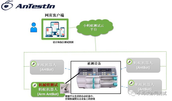如下图所示,通过Antbot控制机械臂对被测设备的按钮进行实际点击,在小蚂蚁测试平台上编辑和执行测试用例,可以代替人工连续自动化测试。