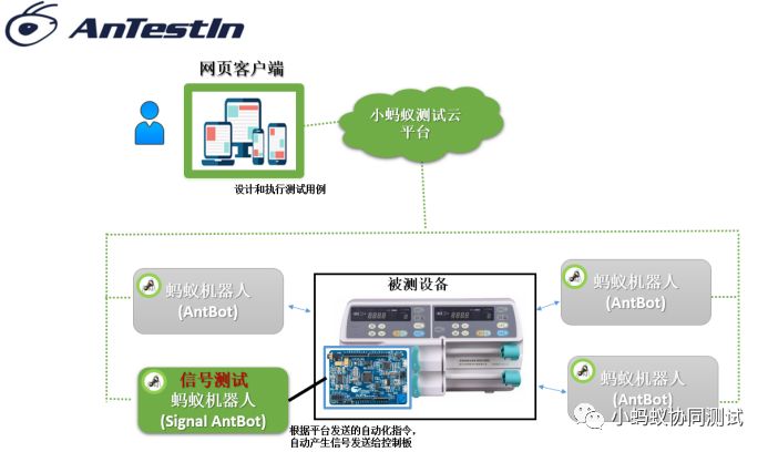 如下图所示,将被测设备控制板上的按钮信号测试点同用于信号测试的蚂蚁机器人管脚相连,然后在小蚂蚁测试平台上编辑和执行测试用例,可以稳定可靠地触发按键进行自动化测试。