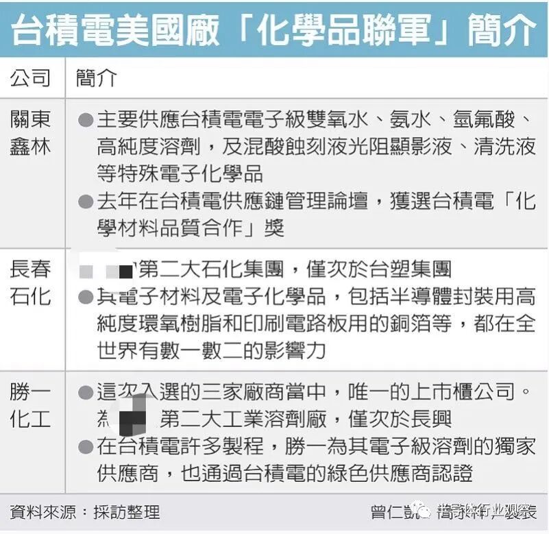 据了解,这支被台积电视为「台湾队」的化学品联军,整个投资计划由关东鑫林主导,但相关成员必须经台积电核可。目前表态愿意参加前进美国投资的成员,还包括台湾知名石化大厂长春石化集团及胜一化工,并持续募集其他厂商加入,估计整个支持台积电赴美设厂的台湾队化学品联军成员将达六家。