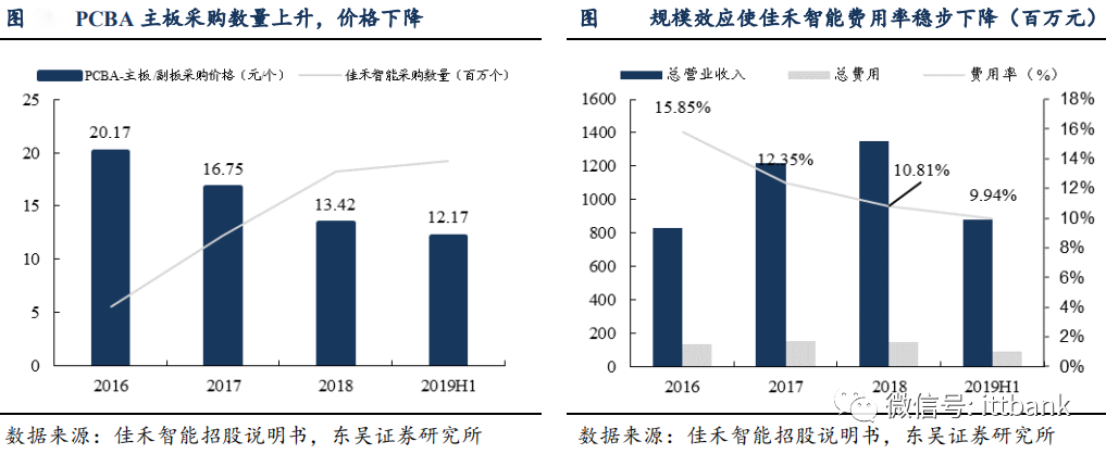 根据佳禾智能招股说明书数据,随着佳禾智能采购 PCBA(集成了蓝牙芯片的主板)数量的上升, 采购成本显著的下降;随着佳禾智能的营收上升,整体费用较稳定,费用率逐年下降。