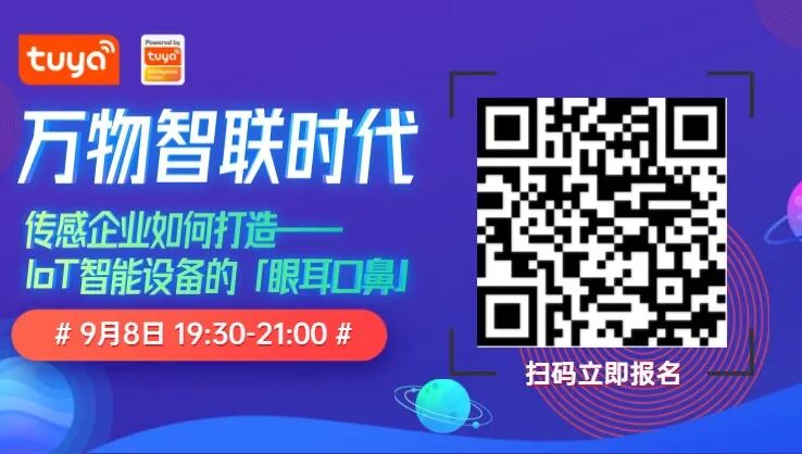 2020年9月8日晚7点半,涂鸦智能传感产品负责人刘亚文、人体感应和微波感应行业专家何雁才,将为您带来精彩直播——《万物智联时代:传感企业如何打造IoT智能设备的“眼耳口鼻”》
