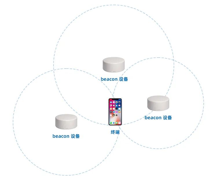 1► 在定位区域部署蓝牙beacon信标,根据三角定位算法一般需要至少3个信标,信标会每隔一定的时间广播一个数据包到周围;