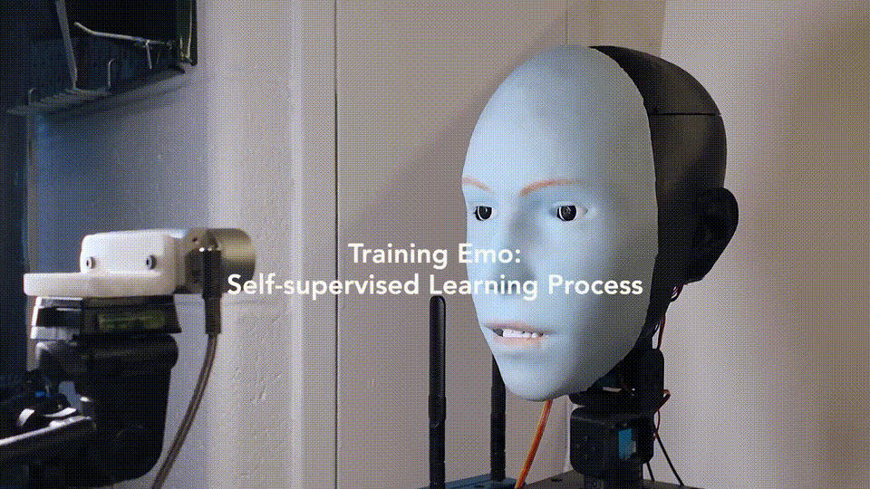 为了训练机器人如何做出面部表情,研究人员将Emo放在相机前,让它做随机的动作。