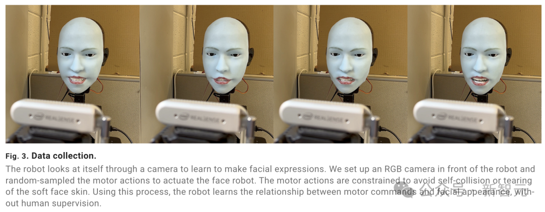 研究人员以自我监督的方式,通过随机的 「电机咿呀学语 」过程收集数据。在将指令发送到控制器之前,该过程会自动删除可能会撕裂面部皮肤或导致自碰撞的电机指令。