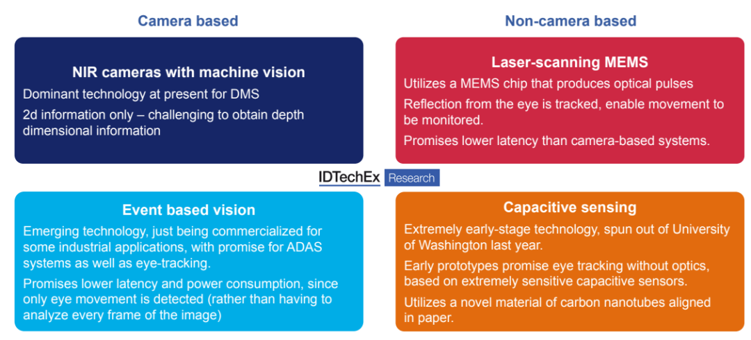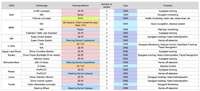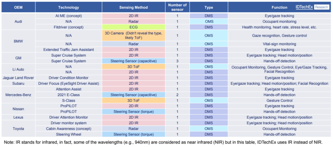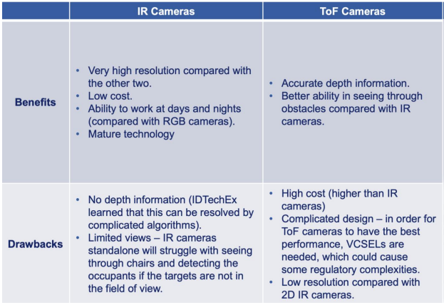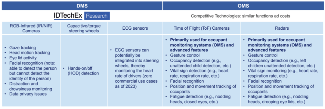 截至2023年,DMS和OMS最常见的三种技术是NIR摄像头、ToF摄像头和雷达,每种传感器都有优缺点。