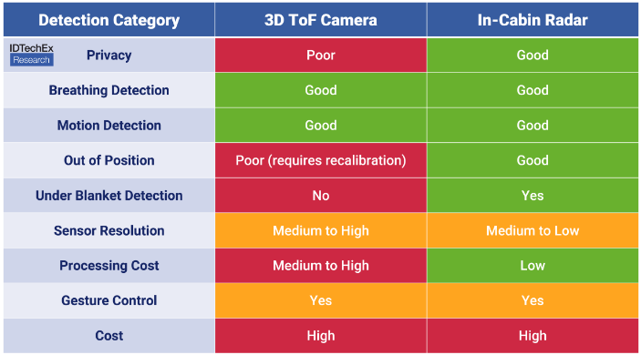 3D ToF摄像头的另一个限制是,与舱内雷达模块不同,无法通过阻隔物探测人或物体。此外,由于依赖计算机视觉技术,摄像头需要复杂的算法和重新校准,给其实现带来了复杂性。尽管如此,一些供应商仍在努力解决隐私问题,提高3D ToF摄像头的OMS整体能力。