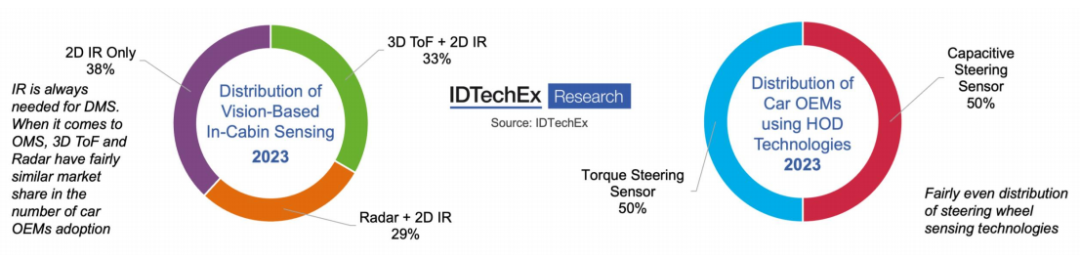 2023年,DMS的主导技术仍然是2D NIR成像传感器(如CCD传感器等),并与LED照明和其他组件(透镜、芯片等)结合。不过,对高级功能日益增长的需求,如占用检测、增强安全功能(如儿童和宠物检测)及手势控制的集成,推动了对3D数据的需求。在OMS中收集3D信息的两种有前途的传感器是雷达和3D ToF摄像头。