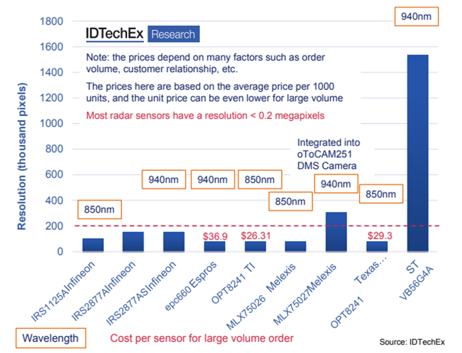 ToF传感器分辨率至关重要。英飞凌和迈来芯等的ToF传感器在DMS或OMS方面显示出巨大潜力。与RGB成像的传感器不同,ToF的成本高得多(舱内监测约为30美元),但3D ToF传感器/摄像头与传统2D摄像头相比更具优势。