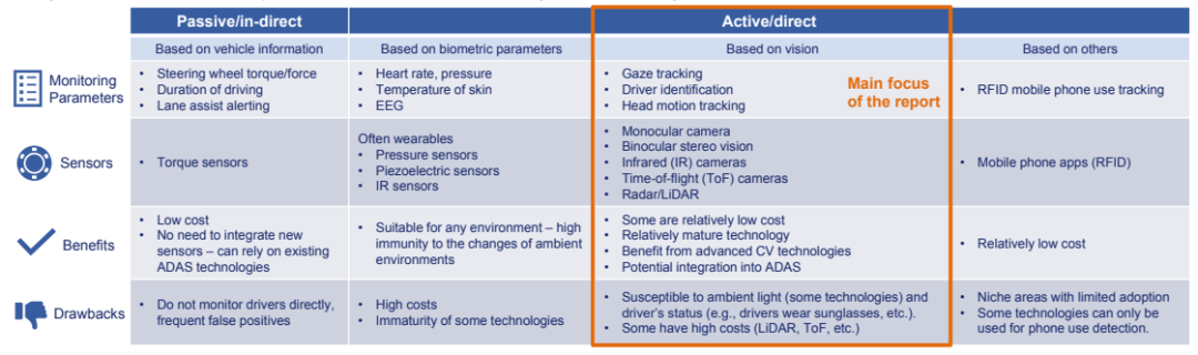 事实上,DMS并非是一个新概念,传统DMS通常依赖从车辆收集信息的被动技术,如车道保持和驾驶持续时间及转向传感器,误报率很高。而ADDW法规规定了向主动监测驾驶员眼球运动过渡,标志着从被动技术向基于视觉的主动技术转变。