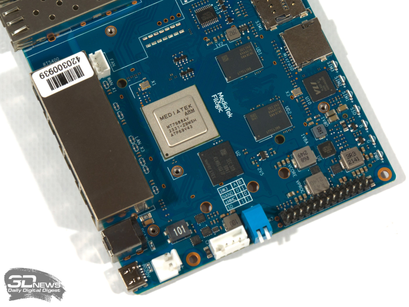 BPI-R4 支持从内置 eMMC 或 NAND 内存以及 microSD 卡加载操作系统 - 可以通过开关更改源。诚然,SD 和 eMMC 与通用 SoC 控制器绑定,因此要在 eMMC 上安装操作系统,您首先必须从 NAND 启动。从SSD启动的能力在技术上是存在的,但由于缺乏用于U-boot的NVMe驱动程序而尚未实现。还有一个用于控制台访问的 UART 串行接口连接器以及 26 个 GPIO 引脚。