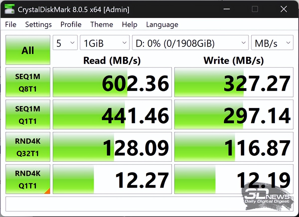 iSCSI 在传输小块方面要好得多。我们使用标准 Windows 11 启动器对此进行了检查;在 LUN 上创建了一个 NTFS 分区。同时,线性读取速度大幅提升,但写入速度却下降。使用 MTU 9000 的结果可能会更好,但尚无法启用完整的巨型帧。