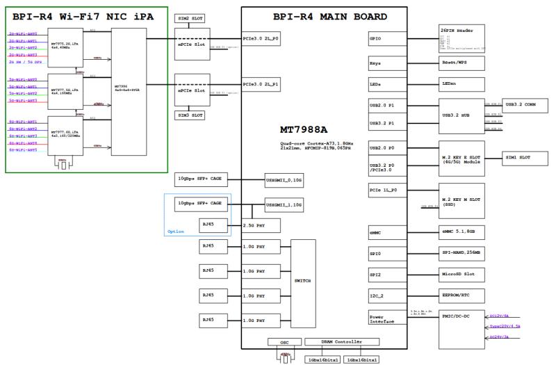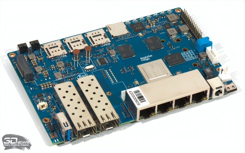 Filogic 880 平台采用联发科技 MT7988A 处理器,具有四个运行频率为 1.8 GHz 的 ARM Corex-A73 内核,以及用于 NAT、VLAN、QoS 和 PPTP/L2TP 隧道等功能的硬件加速单元。该 SoC 使用 4GB DDR4 RAM。板载驱动器由 128 MB SPI-NAND 芯片和 8 GB eMMC 内存组成。该设备还配有 microSD 读卡器、多个内部 PCIe 3.0 连接器(包括用于 NVMe SSD 的连接器),并通过 USB 3.2 Gen 1 (USB 3.0) 接口与外围设备配合使用。 BPI-R4 的主要特点是两个 10GbE SFP+ 端口。连接到集成到 SoC 中的交换机的另外四个 RJ45 端口 (8p8c) 仅限于 1GbE。对于 WAN 连接,您可以使用 SFP+ 或 RJ45。