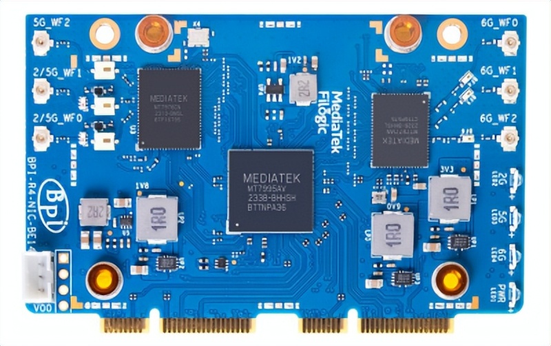 后者同时占用两个mini PCI-E插槽(因此有两条PCIe 3.0线),并由12V电压供电。对于mini PCI-E来说,这是非标准电压,因此必须使用开关激活。 BPI-R4-NIC-BE14 具有三个用于 6 GHz 天线的连接器以及另外三个连接器,这些连接器指向同时使用的 2.4 和 5 GHz 范围。