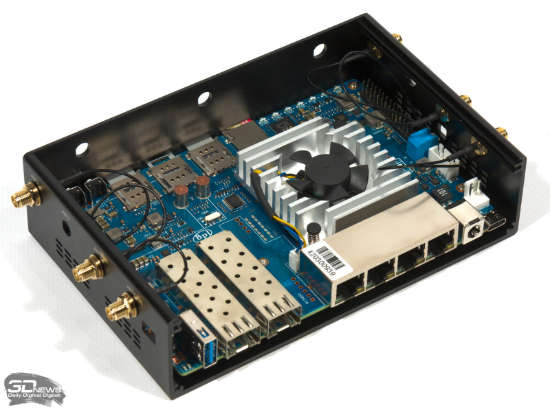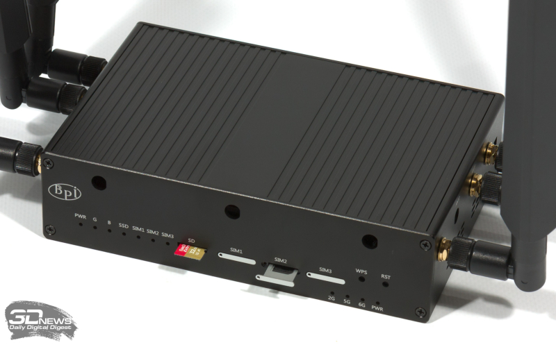 inoVoip 为 BPI-R4 提供两种外壳 - 丙烯酸和铝制外壳,您可以在照片中看到。与许多家用路由器(159 × 104 × 41 毫米)相比,该机箱的尺寸非常适中,尽管具有工业外观,但质量非常高。所有指示灯、按钮和外部接口(包括UART和启动设备开关)都打了整齐的孔。 SIM 卡托盘也与外壳完美贴合,但SinoVoip 不建议将其插入空的插槽中,因为存在损坏触点的风险。