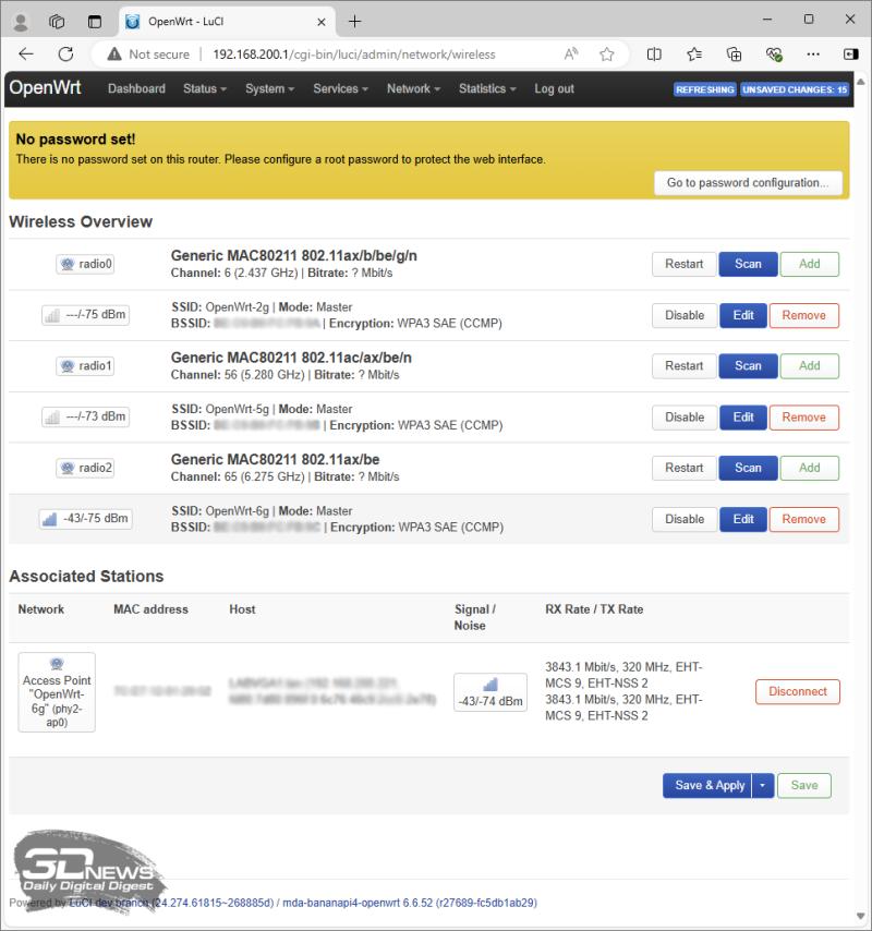 幸运的是,当前的 OpenWrt 在快照级别支持 BPI-R4 (每日构建不稳定),并包含开源 MediaTek MT7995/MT7996 驱动程序,OpenWrt 论坛正在报道进展情况。最新版本已经实现了比具有封闭驱动程序的 OpenWrt 更好的 Wi-Fi 性能,这就是我们在所有基准测试中使用它们的原因。