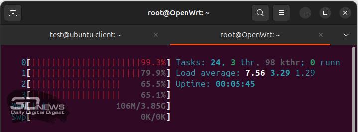 BPI-R4 在 PPTP 和 L2TP 隧道方面展示了出色的性能,最高可达 2 Gbps 及以上,但个别结果因所选协议和加密方法的不同而有很大差异。经过多线程优化,消费者协议的工作效果也不比 L2TP 差。在此任务中,该设备具有四个处理器内核,非常方便,如下图所示,因为系统仍然在软件中执行流量封装和加密,无需专门的 SoC 逻辑。