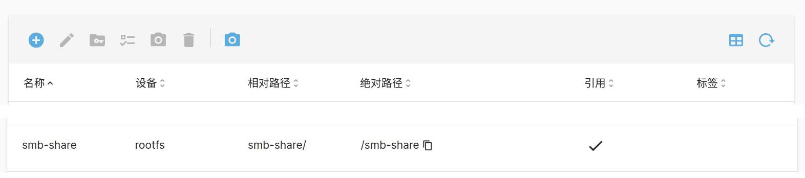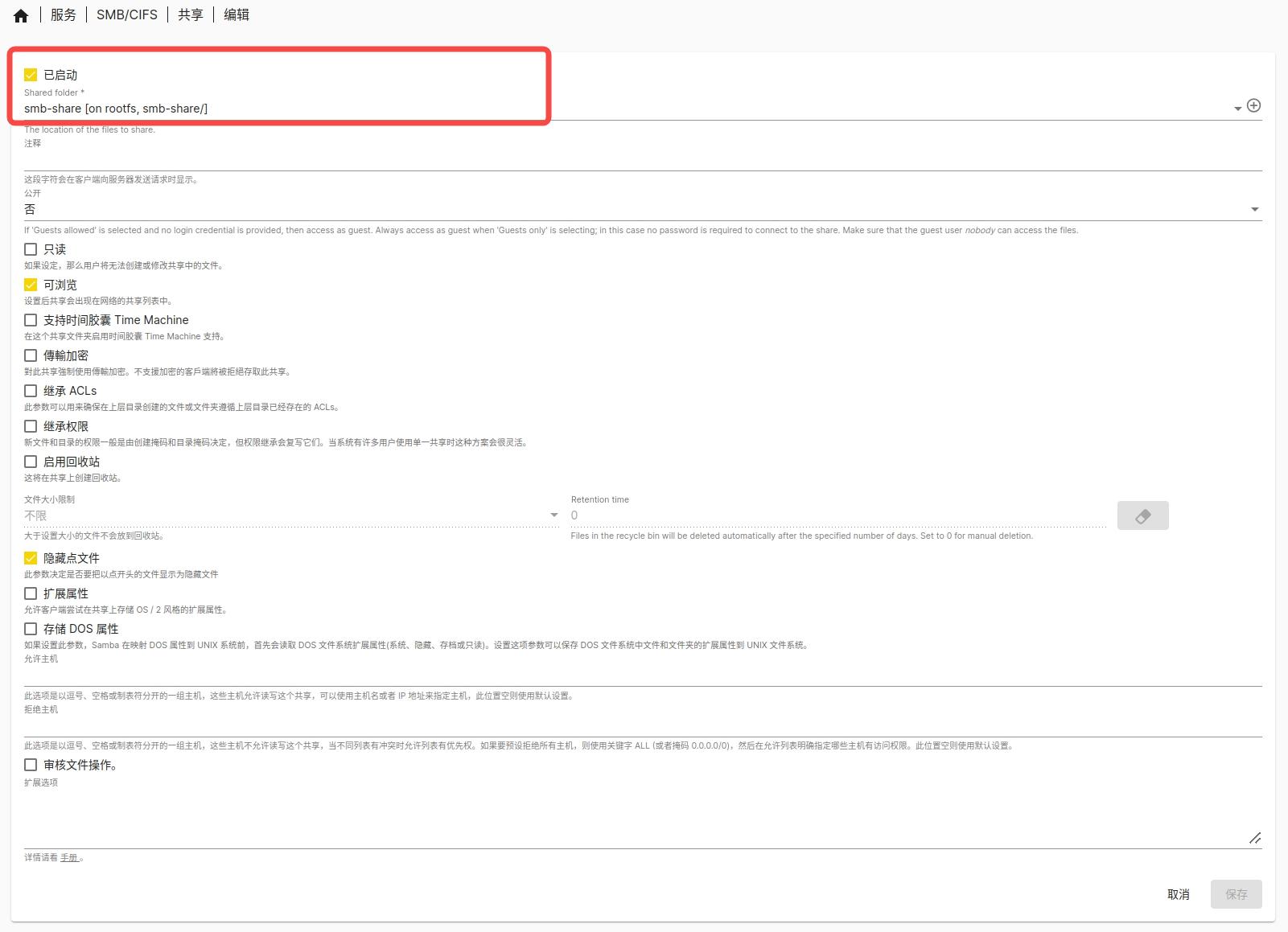 进一步,点击“服务- > SMB/CIFS -> 共享”,设置具体的 SMB 服务实例,这一步要选择共享文件夹(以 smb-share 为例)。