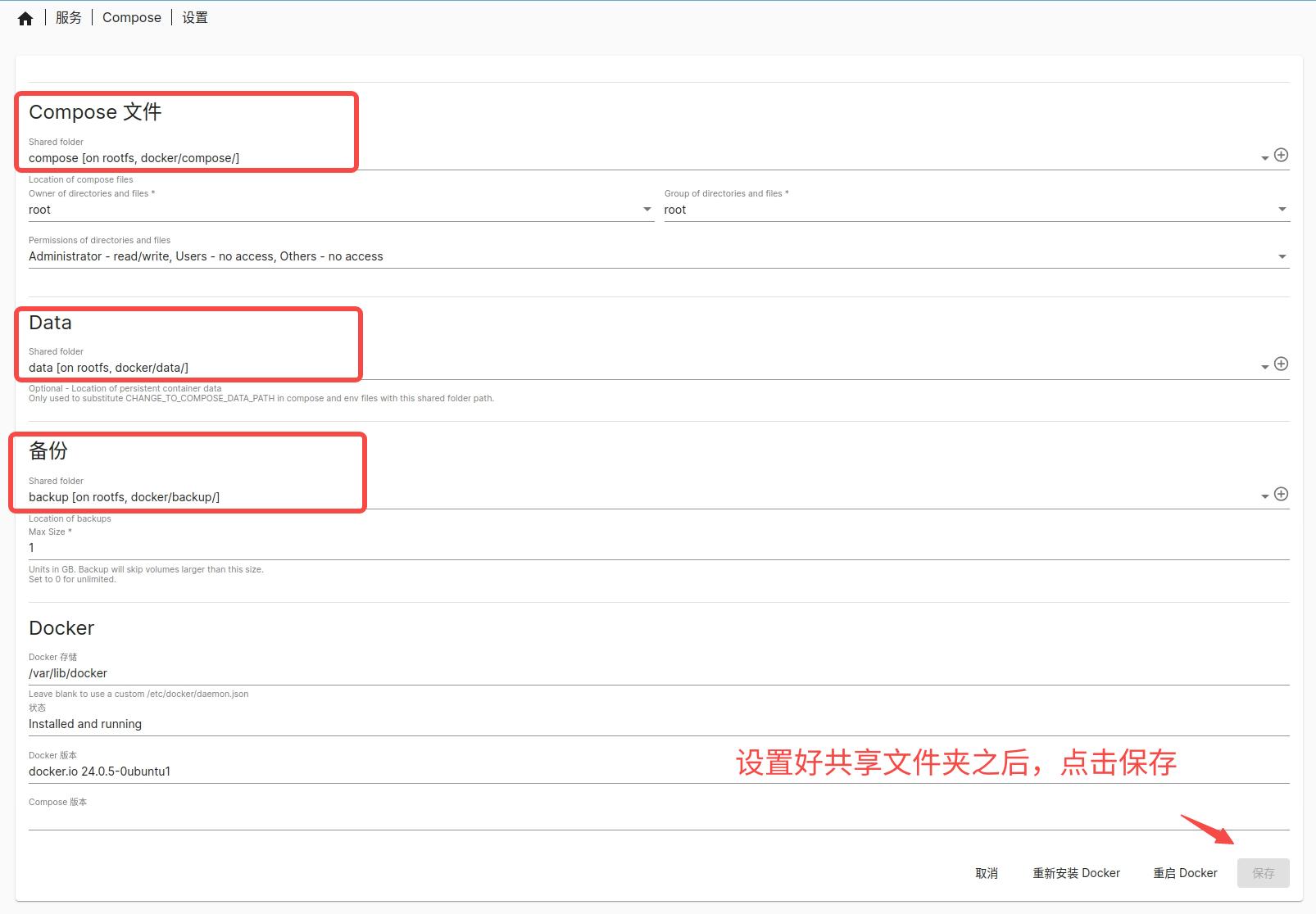 打开“服务 -> Compose -> 设置”,选择共享文件夹,启动 Docker 服务。