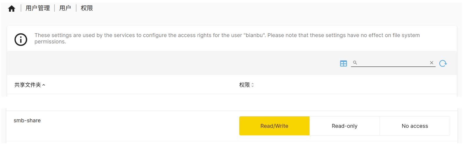 点击“用户 -> 用户 -> 共享文件夹权限 ”,设置用户对共享文件夹的权限。设置 bianbu 用户对 smb-share 共享文件夹的权限为可读可写。
