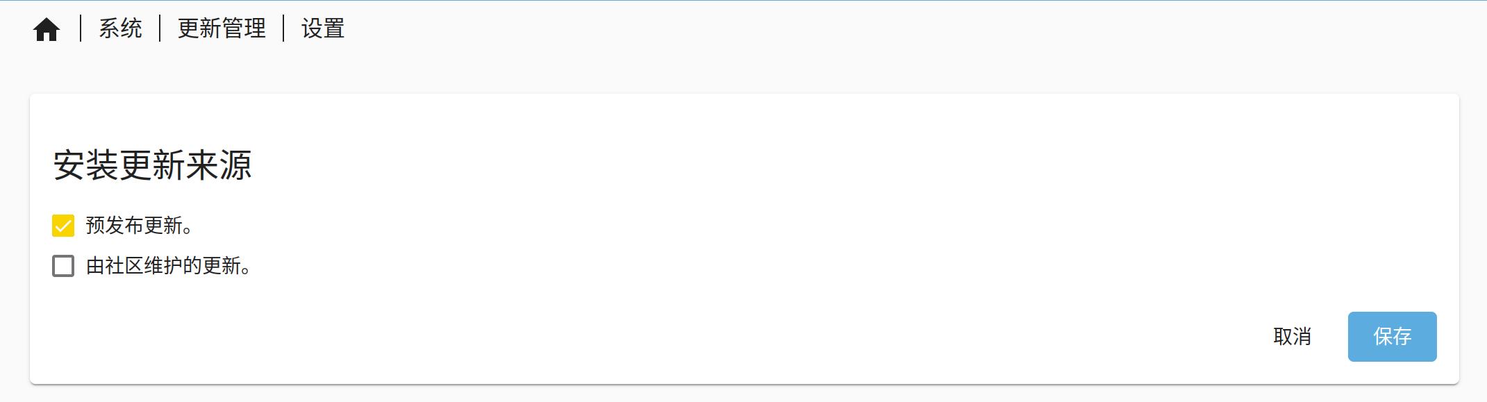 点击“系统 -> 更新管理 -> 设置”, 勾选“预发布更新”,点击“保存”,等待更新。