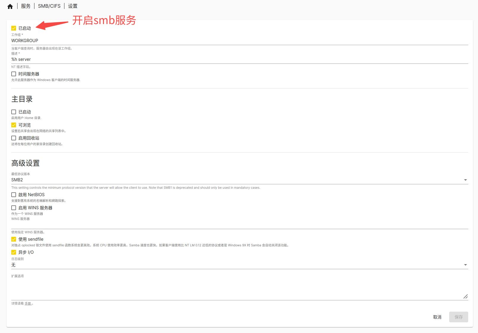点击“服务 -> SMB/CIFS -> 设置”,配置 SMB 服务,这里的设置是全局的,对所有 SMB 服务实例有效。