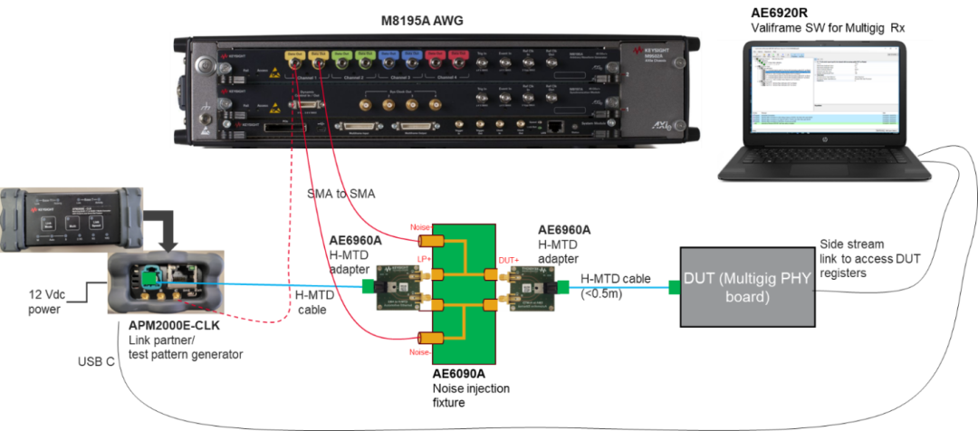 测试设置包括 M8195A 65GSa/s 任意波形发生器,用于生成高质量的测试信号;AE6090A 噪声注入夹具,用于在测试信号中注入串扰噪声;以及 APM2000E-CLK 链路伙伴,用于模拟实际的通信链路。此外,进行信号校准需要 InfiniiMax UXR ≥10GHz 示波器,以确保测试信号的准确性和稳定性。具体系统框图可参考下方连接图: