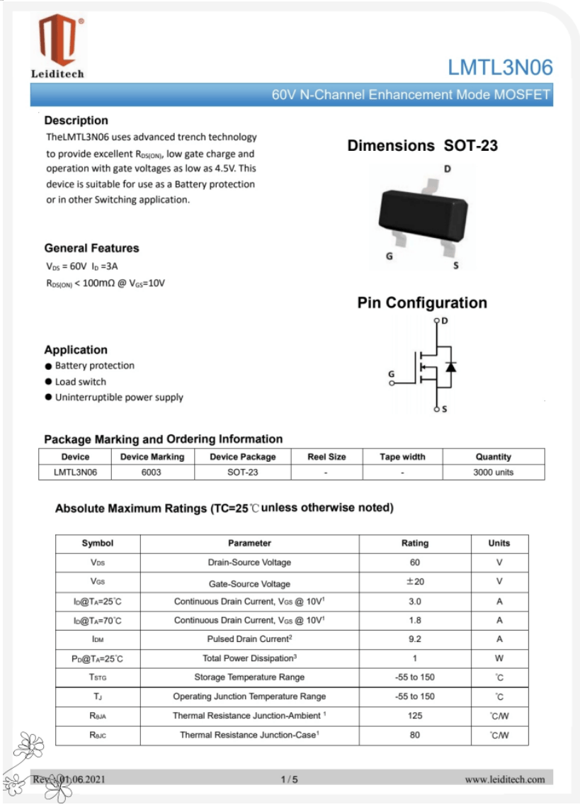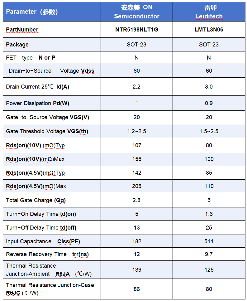 上海雷卯生产的NMOS型号LMTL3N06 pin to pin替代安森美ON Semiconductor的型号NTR5198NLT1G。已经有很多客户选用LMTL3N06 替代NTR5198NLT1G,客户可以获得更好的价格和更快的交期。特别是在一些受空间收下限的小电子设备很受青睐。