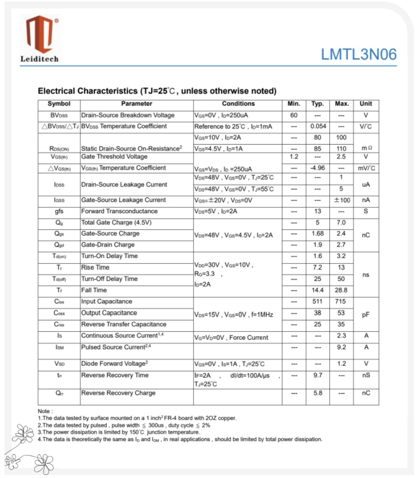 LMTL3N06 是一款性能优异的 N 沟道 MOSFET,采用紧凑的 SOT-23 封装,兼具高效率和通用性。其导通电阻低至 100mΩ,显著降低导通损耗,提升系统能效。仅 5.0nC 的栅极电荷和 511pF 的输入电容,使其具备较快的开关速度和更简单的驱动要求。该器件支持 60V 电压和 3.0A 电流,具有良好的导通和开关特性,非常适合便携式电子设备及其他紧凑型低压应用场景。