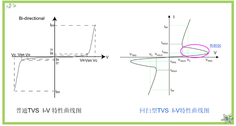 普通TVS的伏安特性曲线像一个对称的“Z”字,而回扫型TVS的曲线更像一个“S”形。关键区别在于负阻区。