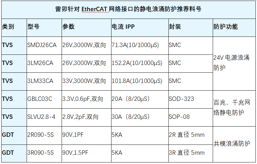 在工业分布式控制场景中,EtherCAT 协议因支持 65535 个从站、纳秒级同步精度,成为汽车生产线、光伏设备、风电变桨系统的核心通信协议;这类场景中,电机启停浪涌、粉尘静电、户外雷击感应等干扰,常导致 EtherCAT 从站断连、帧滑动延迟超标的问题 —— 其根源在于防护方案未匹配 EtherCAT 的 100Base-TX 差分信号特性与拓扑需求。本文结合雷卯 EMC 技术方案,拆解 EtherCAT 协议的专属防护逻辑。