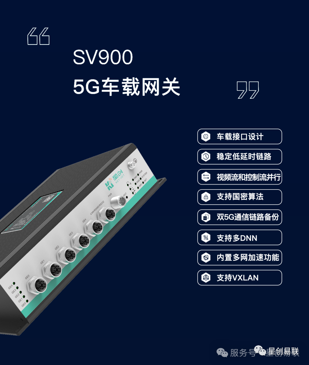 星创易联双5G车载网关SV900,搭载双核高性能处理器,通过M12-X型接口对接车端多种关键车载终端,如域控、雷达等;并借助双5G网络,为无人驾驶提供强有力的网络支撑,保障低延时、大带宽的网络接入能力,且有完备的软硬件自检机制,保障端到云的稳定、高效通讯。