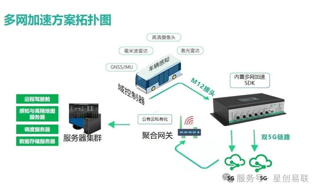 星创易联双5G车载网关SV900搭配腾讯多网SDK,配合腾讯聚合网关,双方共同打造 “硬件冗余 + 云端协同” 解决方案,可实现不同多网加速的效果,抵抗弱网同时保障无人驾驶关键数据传输。