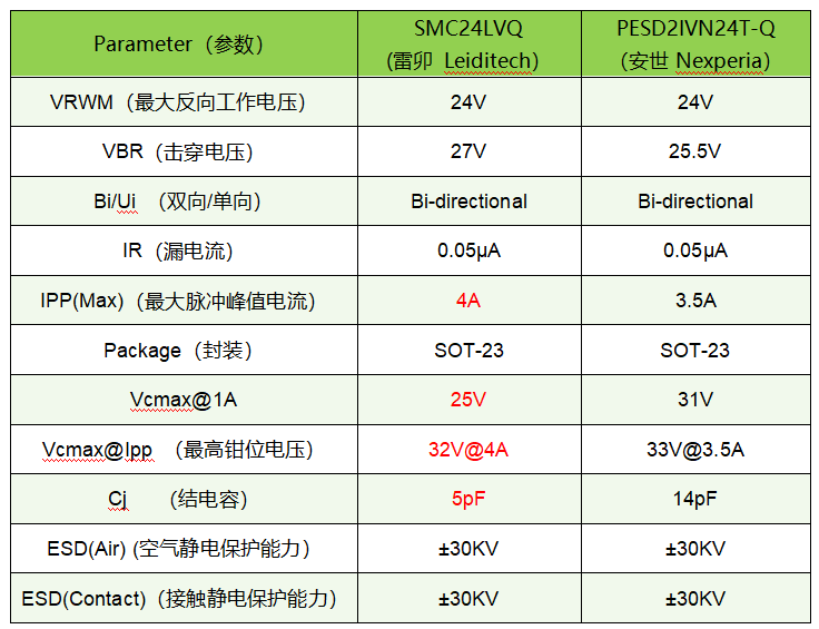 通过对比了知雷卯SMC24LVQ参数性能优于Nexperia的PESD2IVN24T-Q 。
