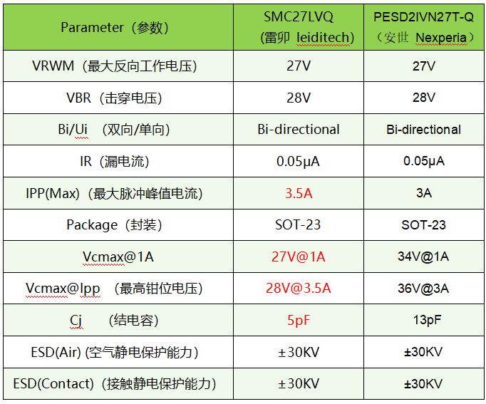 通过对比了知雷卯SMC27LVQ性能参数优于Nexperia的PESD2IVN27T-Q 。