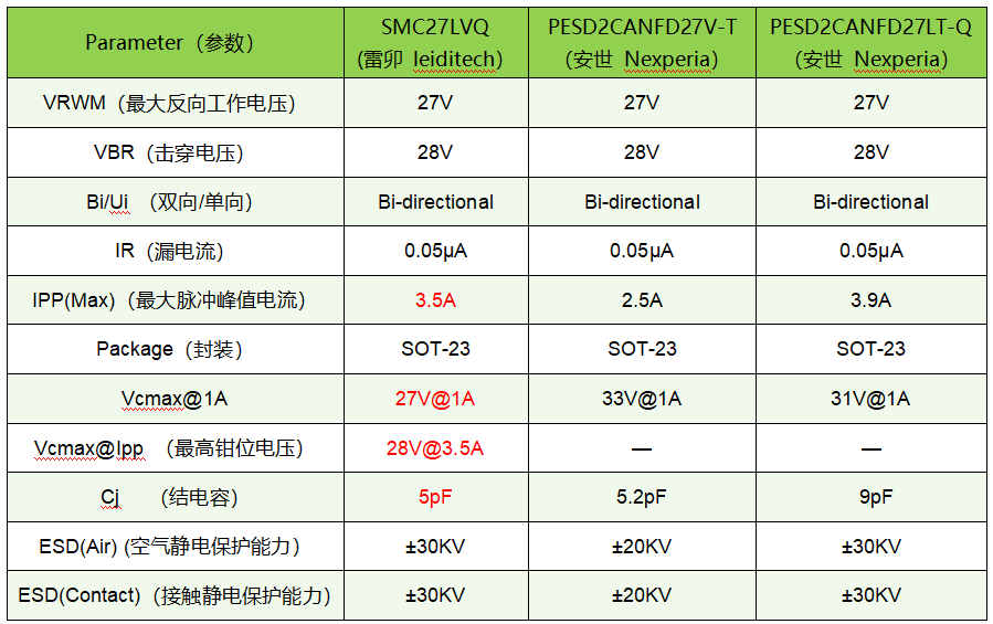通过对比了知雷卯SMC27LVQ性能参数优于Nexperia的PESD2CANFD27V-T,与 PESD2CANFD27LT-Q相当,