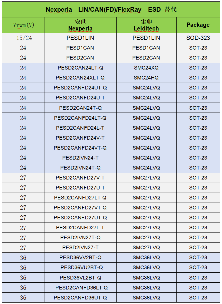 Nexperia 的LIN/CAN(FD)/FlexRay总线常用静电二极管雷卯替代型号如下表一: