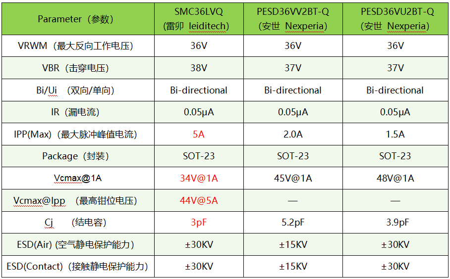 通过参数对比了知雷卯SMC36LVQ性能参数优于Nexperia的PESD36VV2BT-Q ,PESD36VU2BT-Q。