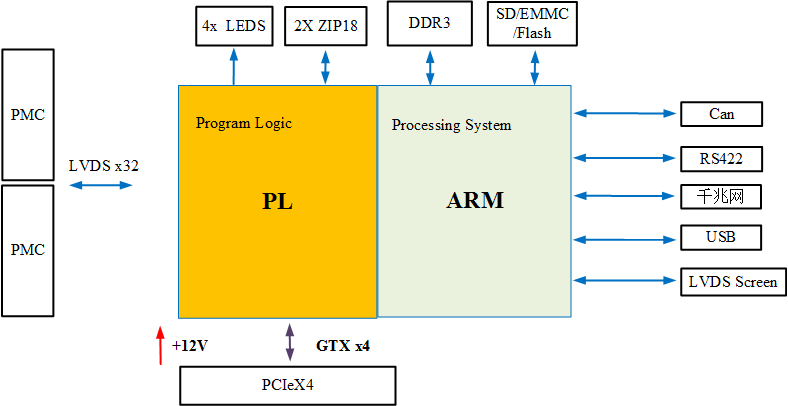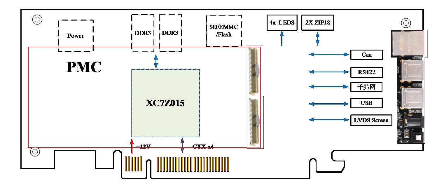 板卡由SoC XC7Z015芯片来完成卡主控及数字信号处理,XC7Z015内部集成了两个ARM Cortex-A9核和一个Artix 7的FPGA,通过PL端FPGA扩展PMC接口、用于扩展震动、噪声、生物信息、加速度等低速信息接入。FPGA自带PCIeX4,网络、USB、RS232等接口。板卡为标准PCIe卡, 可以直接插入PC机,也可以单独网络盒使用,是全能的工业信息采集、控制的扩展底板,也可以扩展触摸屏,作为手持机开发使用。