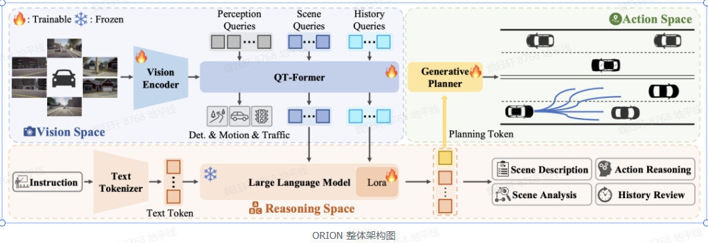 通过视觉语言指令指导轨迹生成的端到端自动驾驶框架。ORION 引入了 QT-Former 用于聚合长期历史上下文信息,VLM 用于驾驶场景理解和推理,并启发式地利用生成模型对齐了推理空间与动作空间,实现了视觉问答(VQA)和规划任务的统一端到端优化。