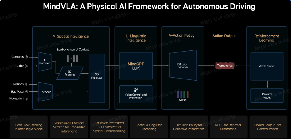 三、智驾中典型 VLA 架构3.1 MindVLA:理想MindVLA 整合空间智能、语言智能和行为智能,基于端到端和 VLM 双系统架构,通过 3D 空间编码器和逻辑推理生成合理的驾驶决策(LM),并利用扩散模型优化驾驶轨迹。LLM 基座模型采用 MoE 混合专家架构和稀疏注意力技术。