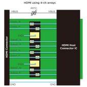 HDMI 也是如今非常流行的一种多媒体信号接口,类似于 USB 的接口,HDMI 接口在使用过程中也容易受到短路过流,静电等各种故障状态,同样我们可以使用 PPTC 器件与 SESD 器件来保护接口免受故障的侵扰。如图 2,在 HDMI 端口的电源线上使用 PPTC 进行过流保护,在其他的信号线上使用多通道的 SESD 防护静电。